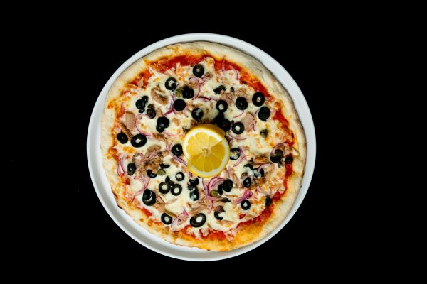 Sos pizza, mozzarella, ton, ceapa rosie, masline, capere, ansoa, lamaie.