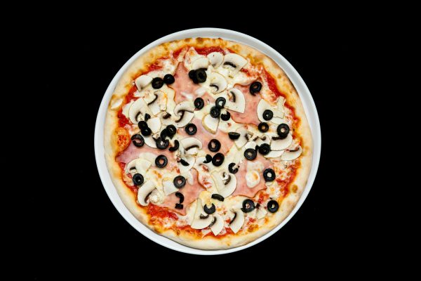 Sos pizza, mozzarella, jambon, ciuperci, masline.