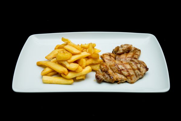 Pulpe de pui dezosate fara piele, cartofi prajiti, salata de varza, 1/2 focaccia.