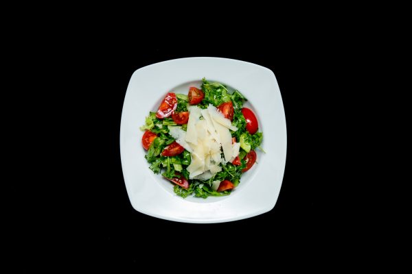Salata de rucola proaspata, mix de salata proaspata, rosii cherry, parmezan Grana Padano, dressing.